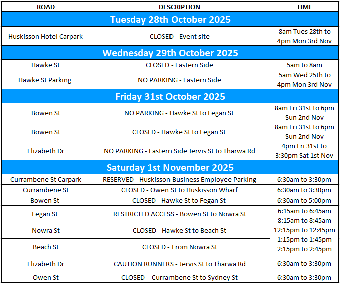 To capture the energy of the Run Huskisson event, some temporary road and car park closures will be in effect. These measures are in place to ensure a safe and seamless experience for both participants and spectators. Thank you for your understanding and support!